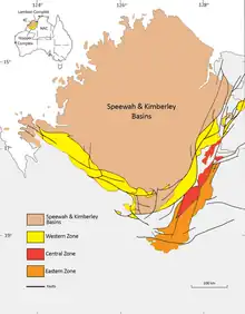 Simplified geological map of the Kimberley region, showing the three major zones of the Lamboo Complex. Inset shows the location on the continent of Australia.