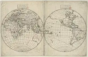 The Theory of the Terrestrial Globe brought Nicolosi to the attention of broader scientific circles and earned him the Chair in Geography at Sapienza University of Rome. In late 1645, Nicolosi travelled to Germany at the invitation of Ferdinand Maximilian, margrave of Baden, where he remained until 1647.[7] In 1647 he returned to Rome, and was appointed chaplain at Santa Maria Maggiore.[1] In 1652, possibly motivated by Nicolas Sanson's new collection of maps, the Sacred Congregation for the Propagation of the Faith (Propaganda Fide) hired Nicolosi to compose a new atlas. After twelve years of study and research, he published the Dell’Hercole e studio geografico, in two volumes with maps and directions for making maps and globes.[5] The first volume was principally occupied with a detailed description of the countries of the world, while the second formed an atlas of twenty-two newly devised maps — two of the hemispheres, and four devoted to each of the five continents. In this atlas Nicolosi was the first to employ the so-called polyconic or pseudo-perspective projection on a printed map.[8] This projection technique was suggested in the eleventh century by the Persian mathematician al-Bīrūnī.[9] Nicolosi reinvented al-Bīrūnī's projection as a modification of Fournier's first projection. It is unlikely Nicolosi knew of al-Bīrūnī's work, and Nicolosi's name is the one usually associated with the projection.[10] This became a standard method of showing the two hemispheres of Earth during the nineteenth century after the equatorial stereographic projection popularized by Gerardus Mercator finally fell into disuse.[10]