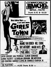 Girls Town is a 1959 American drama film directed by Charles F. Haas and starring Mamie Van Doren, Mel Tormé, and Ray Anthony. Paul Anka also appears in his first acting role. Van Doren stars as a juvenile delinquent who is sent to a girls' school run by nuns, where she finds herself unable to help her sister. The film capitalizes on the 1950s rebellious-teen exploitation films, with catfights, car races, music from Anka and The Platters, and sexy outfits.