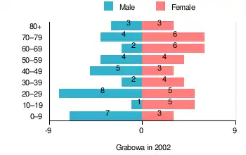 According to the 2002 Poland census, there were 75 people residing in Grabowa village, of whom 48% were male and 52% were female. In the village, the population was spread out, with 20% under the age of 18, 33.3% from 18 to 44, 14.7% from 45 to 64, and 32% who were 65 years of age or older.[1]