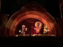 The next scene has characters similar to 'It's a Small World' with dancing animatronics and a Donald Duck piñata. Once past this area, guests enter a cave, which features different scenes of live-action footage with the Caballeros. After leaving the cave, there are three panels featuring a Mariachi band in the first, some Mexican girls and Donald in the second and Panchito and José pulling Donald away from the girls in the third. From here, guests float into Mexico City, where fireworks are going off overhead and the Three Caballeros are finally performing their concert.