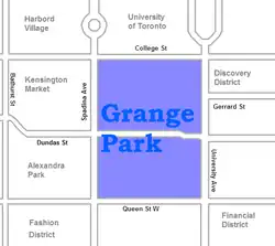 Grange Park is a neighbourhood in downtown Toronto, Ontario, Canada. It is bounded on the west by Spadina Avenue, on the north by College Street, on the east by University Avenue and on the south by Queen Street West. It is within the 'Kensington-Chinatown' planning neighbourhood of the City of Toronto. Its name is derived from the Grange Park public park. The commercial businesses of Chinatown extend within this neighbourhood.
