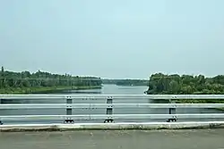 The river continues north under Ontario Highway 101, passes over the Upper Falls and series of unnamed cataracts and enters Cochrane District at geographic Enid Township.[6] It continues north through the Flying Post 73 Indian Reserve,[6][7][8] part of the Flying Post First Nation, over unnamed cataracts, jogs west then again north over the course of the Six Mile Rapids and takes in the left tributary Ivanhoe River and right tributary Nat River. The Groundhog River again jogs west, takes in the left tributary Otapingshewee River, then heads north through the Ten Mile Rapids, passes over the Carmichael Falls Generating Station and dam[5][9] and takes in the left tributary Wakusimi River. It heads around Bremner Island, and reaches the community of Fauquier in the incorporated township of Fauquier-Strickland. It is crossed there by Ontario Highway 11 and by the Ontario Northland Railway secondary main line, formerly a Canadian National Railway secondary line and originally the National Transcontinental Railway transcontinental main line.