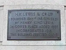 H. K. Lewis & Co. Ltd. was founded in 1844 by Henry King Lewis (born 10 February 1823 in Margate, died 30 January 1898 in Hastings)[1][2] at 15 Gower Street as a small bookselling and stationery business.[3] In the 1871 census he had expanded his business and become a publisher. The firm was incorporated in 1915.[2]