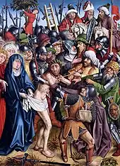 He may be identifiable with the painter known as the Master of the Karlsruhe Passion, the notname of an outstanding artist of the Late Gothic Upper Rhenish school.[4] Dated to around 1450, six panels from the Karlsruhe Passion are now in the Staatliche Kunsthalle Karlsruhe and one of the deposition of Christ is now in the Wallraf-Richartz-Museum in Cologne.[5]