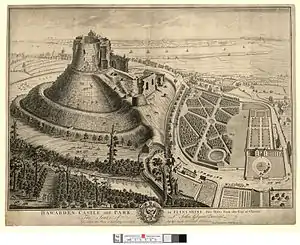 After the English Civil War in the 17th century the castle was slighted on the orders of Oliver Cromwell. Its ruins are on the New Hawarden Castle estate and are open to the public on some Sundays, typically the second and fourth Sundays in summertime.[3]