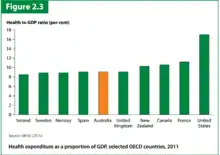 Australia's health-expenditure–to–GDP ratio (~9.5%) in 2011–12 was slightly above average compared with other OECD countries.[14]