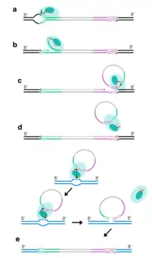Evidence supporting the "read-through" models seems to lie in the relative lack of importance of the 3' RTS when compared to the 5' LTS:[10][12] deletion of the LTS leads to a severe reduction in the efficiency of helitron transposition, whereas the complete deletion of the RTS still leads to significant transposition despite a reduced number of copies.[12] The RTS indicates to the Rep-Hel protein the end of the helitron and thus the end of transposition. The whole of this information lies in the hairpin structure formed by the palindromic sequence of DNA in the 3' end. Such a small structure is likely to be modified over time, enabling to by-pass the helitron's end during its transposition and to capture neighbouring gene sequence.
