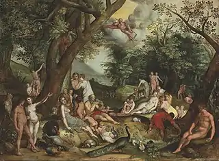 He is considered a member of the Frankenthal school in his landscape work.[1] The Frankenthal school is the name given to a group of Flemish painters who had emigrated from the Southern Netherlands because of the Protestant persecution and had settled in Frankenthal (Pfalz) after 1562. The representatives of the school did not have a uniform style but were thematically connected. They showed an interest in small-scale forest landscapes (mostly executed on copper plates) with historical or religious scenes. The most important representatives were Giles van Coninxloo, his pupil Pieter Schoubroeck and Anton Mirou.[3][4] Van der Borcht's Mountain landscape with a big tree (Historical Museum, Frankfurt) is a small scale painting on copper. It shows a rocky river landscape dominated by a mighty tree that rises slightly to the left of the central axis. The tree stands with its visible, spreading root system slightly overhanging the edge of a ridge, which leads from the left foreground into the deep. On the right the terrain as well as the gorge and the towering mountain drop away sharply into a deep river valley. Two travelers with pointed hats and walking sticks are the only living creatures in the scene. The picture demonstrates in the landscape's layout as well as its small-figure staffage the influence of Jan Brueghel the Elder (1568-1625), who had created similar compositions in Rome around 1595.[5]