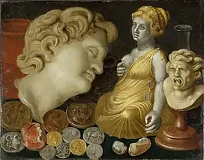 Van der Borcht painted a few still lifes painted on copper representing collections of antique statutes, objects and coins. One (Hermitage, Leningrad) is a large composition in a circular format showing a complex collection of statues, medals, coins, vases and a bowl, against a dark green ground. A second (Historisches Museum, Frankfurt) is in horizontal format.[6] It shows antique sculptures, coins, cameos and simple vessels distributed on a tablecloth.[7] Several items reappear in more than one of these still lifes, such as the bust of a scowling man which is depicted in both the Frankfurt and Hermitage still lifes, and several of the classically-styled cameos. This makes it likely that the artist painted them after an actual collection, possibly his own.[6] These still lifes of collection objects are close to the paintings of collection cabinets, which emerged shortly after 1600 in Antwerp. These Antwerp paintings featured more or less fictional art and curiosity collections.[7]