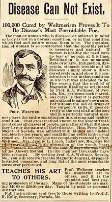 "Disease Can Not Exist", October 1899 advertisement in the People's Home Journal for Weltmerism, a form of "magnetic healing"