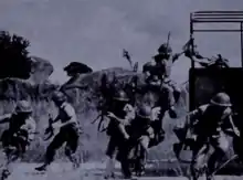 12 Troop entered Mozambique on 31 July 1968 and contacted the enemy around noon, when Strong heard voices ahead and ordered his men out for a sweep. The guerrillas, encamped under trees on a slightly higher position on the other side of a dry riverbed, opened fire, wounding an RLI trooper. Strong called on the insurgents to surrender, to which they responded with obscenities and anti-white racist slogans before resuming fire.[58] 12 Troop took cover and tossed phosphorus grenades to mask their advance; the men on the left rushed up the slope beneath the smoke and positioned themselves to the cadres' right. Under attack from the front and the right flank, the ZIPRA fighters soon fled, leaving seven dead and one wounded. Petter-Bowyer and the helicopters now arrived to give air support and wounded two insurgents, who took cover in a small, naturally formed tunnel. Lance-Corporal Lahee and one other man chased them to the tunnel and captured them. Of the remaining five guerrillas, four were killed and one captured.[n 10] The focus now moved to the other group of cadres being chased south by Pearce's men.[58][60]