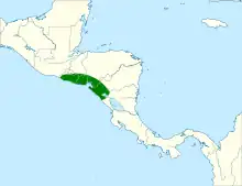 The Honduran Fruit Eating bat has a relatively narrow range compared to other closely related species.[2] It is found along the pacific border of central America, from El Salvador to Nicaragua, and lives at much lower elevations than closely related bats in the genus, rarely exceeding 200 m above sea level.[2] The Honduran fruit-eating bat resides in thorn-scrub habitats, and have been captured in mist nets over streams and in banana groves. They are also known to use empty houses as day time roosts.[1][2]