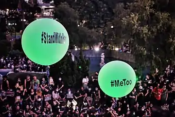 Many protestors claimed on been sexually harassed and assaulted throughout the movement of protesting, actions such as female protestors being filmed and being exposed with only underwear while being arrested in the police station, as well as the shameful and unessential removal of clothing, were being embodied.[116] The action of reporting the assaults and harassment had led to several hateful results, including personal information being revealed online, being a victim of fake sexual video, and telephone harassment from anonymous people who believed to be police and citizens who are against the protestors.[116] Only a few out of much sexual violence towards female protestors were being photographed by the journalist, male police exposed protestors' underwear and private area in front of the public while being carried and dragged,[125] protestors' breasts were grabbed by the police,[126] being forced to reveal the upper body as the polices has lifted the female protestor's top.[127]