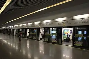Hongqiao Railway Station (simplified Chinese: 虹桥火车站; traditional Chinese: 虹橋火車站; pinyin: Hóngqiáo Huǒchēzhàn) is a Shanghai Metro station located within the Shanghai Hongqiao railway station complex in the city's Minhang District. As part of a major transportation hub, it serves as an interchange between Lines 2, 10, and 17. It additionally serves as the western terminus the mainline service of Line 10, as well as the eastern terminus of Line 17. The station first opened as a Line 2 station on 1 July 2010, with Line 10 operations commencing on 30 November 2010. More than seven years later, Line 17 service was introduced with the opening of that line on 30 December 2017. With three island platforms totaling six platforms, the station is one of the largest in the system and features a cross-platform interchange between Lines 2 and 17.