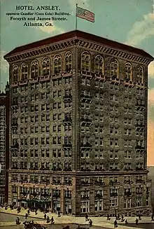 Following the war, Atlanta rebounded and began to rebuild at a rapid pace. New hotels arose to replace those lost during the war, including the Kimball House (1870) and the Markham House (1875). While many of the hotels before and after the war were built around State Square in downtown Atlanta, by the 1890s many of the newer hotels were being built north of the area along "upper Peachtree". Some of these notable buildings included the Majestic Hotel (1898) and the Piedmont Hotel (1903).[6][7] Also starting around this time, several hotels opened on Hotel Row near the newly opened Terminal Station in South Downtown. Among these was the Terminal Hotel, built in 1906 by prominent Atlanta businessman Samuel M. Inman.[8] However, stiff competition from other hotels in downtown caused the area to experience a decline a few decades later.[9]