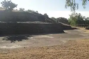 Ehécatl round temple probably used for ceremonial purposes, measuring some 15 meters in diameter. The structure has three stacked concentric round stages.[1]