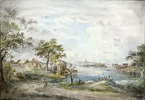 Jean Fredman (1712 or 1713–1767) was a real watchmaker of Bellman's Stockholm. The fictional Fredman, alive after 1767, but without employment, is the supposed narrator in Bellman's epistles and songs.[5] The epistles, written and performed in different styles, from drinking songs and laments to pastorales, paint a complex picture of the life of the city during the 18th century. A frequent theme is the demimonde, with Fredman's cheerfully drunk Order of Bacchus,[6] a loose company of ragged men who favour strong drink and prostitutes. At the same time as depicting this realist side of life, Bellman creates a rococo picture, full of classical allusion, following the French post-Baroque poets. The women, including the beautiful Ulla Winblad, are "nymphs", while Neptune's festive troop of followers and sea-creatures sport in Stockholm's waters.[7] The juxtaposition of elegant and low life is humorous, sometimes burlesque, but always graceful and sympathetic.[2][8] The songs are "most ingeniously" set to their music, which is nearly always borrowed and skilfully adapted.[9]