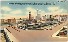 Postcard depiction of King Street Station and Union Station in the late 1930s, including the future site of International District/Chinatown station