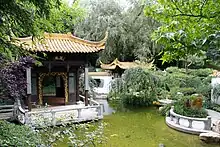 The core of the exhibition was 23 international gardens, planned by gardeners and landscape architects from all over the world.[2] Most erected a small building according to their national tradition and planted their native flora. Four Asian nations built lasting gardens, two of them with support by German merchants active in those countries. The People's Republic of China participated for the first time in a European garden exhibition and contributed a walled garden in the traditional style of a Chinese garden, as a scholar might have built it. Munich's sister city Sapporo build a combination of several traditional elements of a Japanese garden from the Heian period. Thailand erected a Sala with the statue of Gautama Buddha, which became the first consecrated Statue of Gautama Buddha in Germany.[3] Nepal contributed a pagoda in woodwork, that was carved by master carvers in Nepal and transported to Germany. It was the first time for about 200 years that Nepali carvers build a full new pagoda.[2] The transport was used for smuggling of about 400 kg of Hashish in cavities.[4] Those four Asian gardens are preserved, almost all other international gardens were torn down after the show ended.