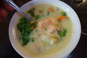 Irish cuisine encompasses the cooking styles, traditions and recipes associated with the island of Ireland. It has evolved from centuries of social and political change and the mixing of different cultures, predominantly with those from nearby Britain and other European regions. The cuisine is founded upon the crops and animals farmed in its temperate climate and the abundance of fresh fish and seafood from the surrounding waters of the Atlantic Ocean. Chowder, for example, is popular around the coasts.[1]