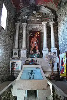 The Museum of Santa María de la Asunción, located just south of the main plaza in the center of town, was the parish church for the community from the 16th century until the mid-20th, when it was declared a national monument. Since the discovery of the alleged Cuauhtémoc's tomb under the main altar, this building and its grounds have been converted from a religious sanctuary to a civil one. Most, but not all, of its Christian iconography has been taken out. Where the main altar used to be is now a shrine to the last Aztec emperor, with his false remains on public display.[11] A small museum occupies the former church’s annex.[3][8] Jairo Rodríguez, son of the doctor who made the documents about Cuauhtemoc's burial public knowledge, is the official chronicler of Ixcateopan and the guardian of the museum.[8]