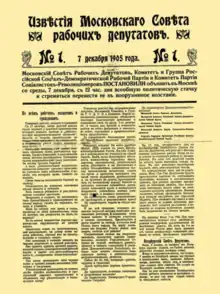Izvestia Moskovskogo Soveta Rabochikh Deputatov was a Russian daily newspaper first issued by the Moscow Soviet during the 1905 Revolution. The title was revived when the Biulleten' Soveta rabochikh deputatov was renamed from March 15 (28) 1917, following the February Revolution.[1]