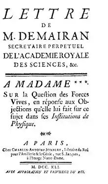 - Lettre de m. de Mairan a Madame. Sur la question des forces vives (1741) (Letter to Mme Chatelet on the Question of Living Forces), one side of a public debate with Émilie du Châtelet on forces vives.