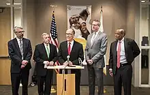 Secretary of Labor Thomas Perez (center) speaks at a press conference at Chicago's Center for Economic Progress. Rogers is on the far right.