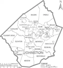 Most early growers in Johnston County were subsistence farmers. A few grew tobacco as a cash crop or reared pigs and cattle, which were sold in Virginia. Smithfield was the westernmost freight port on the Neuse River, and in 1770 the colonial government erected a tobacco warehouse there to store the crop before it was shipped out. Eli Whitney's cotton gin was introduced in the county in about 1804, leading cotton to become the area's leading cash crop. Production for sale at markets remained low before the 1850s due to poor transportation links with other parts of the state. In 1856 the North Carolina Railroad was completed, connecting Johnston County with major urban areas. As result, farming for sale increased, lumber and turpentine industries developed, and the towns of Princeton, Pine Level, Selma, and Clayton were eventually created. About 1,500 Johnstonian men fought in the American Civil War, of whom about a third died. Lingering political tensions and the emancipation of slaves created social and economic turmoil. The new state constitution of 1868 created the county's first townships, which were altered up until 1913.[9] In 1886 the "Short-Cut" line of the Wilmington and Weldon Railroad was laid through Johnston, eventually giving rise to the towns of Kenly, Micro, Four Oaks, and Benson.[10]