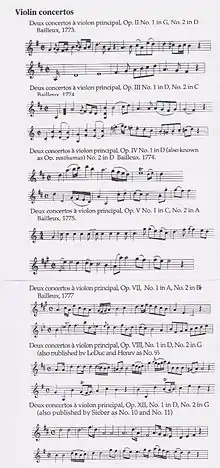 Little is known about Saint-Georges' early musical training; he was sent to Paris to begin his musical studies at age 7. Given his prodigious technique as an adult, Saint-Georges must have practiced the violin seriously as a child.[32] Banat, since 1970 violinist in the New York Philharmonic under Pierre Boulez, discounted François-Joseph Fétis's claim that Saint-Georges studied violin with Jean-Marie Leclair.[16] Some of his technique was said to reveal influence by Pierre Gaviniès. In 1764, when violinist Antonio Lolli arrived in Paris, he composed two concertos, Op. 2, for him.[lower-alpha 3] In 1766, François-Joseph Gossec dedicated a set of six string trios, Op. 9, to Saint Georges.[34] Lolli may have worked with Bologne on his violin technique and Gossec on compositions. In 1769, the Parisian public was amazed to see Saint-Georges, the great fencer, playing as a violinist in Gossec's new orchestra, Le Concert des Amateurs in Hôtel de Soubise.[35]