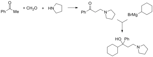Procyclidine, 1-cyclohexyl-1-phenyl-3-pyrrolidinopropan-1-ol, is synthesized in exactly the same manner as was seen for trihexyphenidyl, except this time the linear synthesis begins with the preparation of 3-(1-pyrrolidino)propiophenone.
