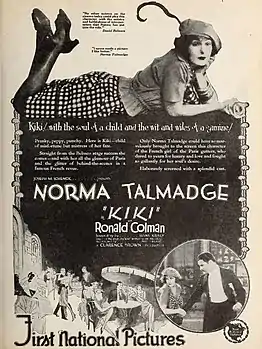Kiki is a 1926 American silent romantic comedy film directed by Clarence Brown and starring Norma Talmadge and Ronald Colman. The film is based upon a 1918 play of the same name by André Picard, which was later adapted by David Belasco and performed on Broadway to great success in 1921 by his muse Lenore Ulric.[1][2]