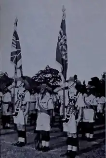 Until independence, the parade uniform of the KAR comprised khaki drill, with tall fezzes and cummerbunds. The latter items were normally red, although there were some battalion distinctions with Nyasaland units, for example, wearing black fezzes. Prior to 1914, the regiment's field service uniforms consisted of a dark blue jersey and puttees, khaki shorts and a khaki fez cover with integral foldable cloth peak and neck flap, the designs according to Sealed Patterns procured from India. To note, although this was official regulation, a caption from 1898 describes the equipment and uniforms as being 'anything procurable' and equipment shortages plagued the regiment throughout its early years.[1] In 1898, good conduct stripes were also introduced, carrying an extra shilling (from originally 5 shillings a month) for those who had not been sentenced for imprisonment, confined to barracks for seven days, to a fine of more than five shillings, or corporal punishment. In addition, they also wore brown leather equipment similar to the 1888 Slade-Wallace British equivalent, but locally produced. Askaris wore sandals or were barefoot, on the rationale that the heavy military boots of the period were unsuitable for African recruits who had not previously worn footwear.[2][3] Fezzes bore an Arabic or Roman number with the wartime-raised battalions wearing theirs on geometric-shaped patches of cloth. During the Great War, all the dark blue items were replaced with khaki equivalents and a short pillbox hat with a khaki cover was worn on campaign. After the war, the khaki shirt was replaced by a collarless blue-grey angora shirt called a "greyback". Officers and senior NCOs wore slouch hats with coloured hackles.