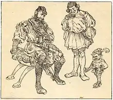 Kobolds who live in human homes are generally depicted as humanlike, dressed as peasants, and standing about as tall as a four-year-old child.[40] A legend recorded by folklorist Joseph Snowe from a place called Alte Burg in 1839 tells of a creature "in the shape of a short, thick-set being, neither boy nor man, but akin to the condition of both, garbed in a party-coloured loose surcoat, and wearing a high-crowned hat with a broad brim on his diminutive head."[41] The kobold Hödekin (also known as Hüdekin and Hütchen) of Hildesheim wore a little hat down over his face (Hödekin means "little hat").[42][43] Another type of kobold known as the Hütchen is said to be 0.3–1 m (0.98–3.28 ft) tall, with red hair and beard, and clad in red or green clothing and a red hat and may even be blind.[44] Yet other tales describe kobolds appearing as herdsmen looking for work[45] and little, wrinkled old men in pointed hoods.[32] Some kobolds resemble small children. According to dramatist and novelist X. B. Saintine, kobolds are the spirits of dead children and often appear with a knife that represents the means by which they were put to death.[46] Heinzelmann, a kobold from the folklore of Hudermühlen Castle in the region of Lüneburg, appeared as a beautiful boy with blond, curly hair to his shoulders and dressed in a red silk coat.[40] His voice was "soft and tender like that of a boy or maiden."[36]