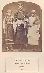 A Kodava woman is called Kodavathi[20] Kodavas have distinctive dresses, the men wearing wraparound robes called the Kupya (now only seen at ceremonial occasions), and the women with a distinctive style of wearing the sari. The Kodava woman wears a sari with the pleats at the back and the loose end pinned at the right shoulder. The men have many distinctive practices such as carrying ceremonial knives, and martial war dances.[21]
