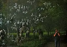 Within the walled triangle are 19 stainless steel statues designed by Frank Gaylord[6] and collectively called The Column.[7] Each statue is larger than life-size, between 7 feet 3 inches (2.21 m) and 7 feet 6 inches (2.29 m) tall; each weighs nearly 1,000 pounds (500 kg). The figures represent a platoon on patrol, drawn from branches of the armed forces; fourteen of the figures are from the U.S. Army, three are from the Marine Corps, one is a Navy Corpsman, and one is an Air Force Forward Air Observer. They are dressed in full combat gear, dispersed among strips of granite and juniper bushes which represent the rugged terrain of Korea.[8]