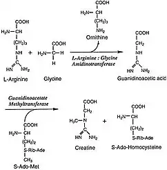 The formation of guanidinoacetate is normally the rate-limiting step of creatine biosynthesis.[3] Consequently, the AGAT reaction is the most likely control step in the pathway, a hypothesis that is supported by a great deal of experimental work. Most important in this respect is the feedback repression of AGAT by creatine, the end-product of the pathway. Cyclocreatine, N-acetimidoylsarcosine, and N-ethylguanidinoacetate display repressor activity like creatine as well. L-Arginine and guanidinoacetate have only "apparent" repressor activity. They exert no effect on AGAT expression by themselves but are readily converted to creatine, which then acts as the true repressor.[4] It has been suggested that AGAT activity in tissues is regulated in a number of ways including induction by growth hormone and thyroxine,[5] inhibition of the enzyme by ornithine,[6] and repression of its synthesis by creatine.[7][8]