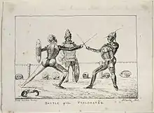 Capt. Levett Landon Boscawen Ibbetson dueling in a trilobite exoskeleton. Drawn by his friend Gideon Mantell, fellow member of the Royal Society.
