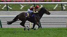 On October 15, she was entered in to the Shuka Sho as previously announced, with the odds at 1.1, making her by far the most favored to win.[25] After making a good start, she placed herself in te middle of the pack. At around the 3rd corner she moved to the outside of the pack and started to make her move, and after taking the lead at the 4th corner she crossed the finish line without letting any other horse contest the lead; making her the 7th horse ever to win the Japanese Triple Tiara, and the first time since Daring Tact in 2020.[26]