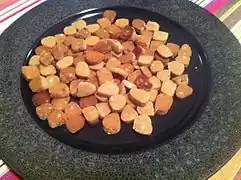 Gebrannte Mandeln Nuts (usually almonds) that have been spiced and candied so they end up coated in a layer of caramelized, crunchy sugar