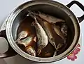 Generally means to cook and simmer in vinegar. Common dishes bearing the term, however, can vary substantially depending on what is being cooked. Paksiw na isda is fish poached in a vinegar broth usually seasoned with fish sauce and spiced with siling mahaba and possibly containing vegetables. Paksiw na baboy is pork, usually hock or shank, cooked in ingredients similar to those in adobo but with the addition of sugar and banana blossoms to make it sweeter and water to keep the meat moist and to yield a rich sauce. Paksiw na lechon is roasted pork lechon meat cooked in lechon sauce or its component ingredients of vinegar, garlic, onions, black pepper and ground liver or liver spread and some water. The cooking reduces the sauce so that by the end the meat is almost being fried. | ||