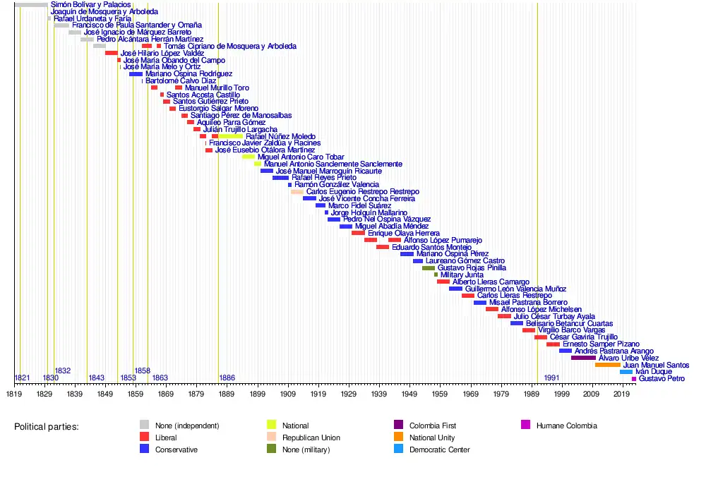 Gustavo PetroIván DuqueJuan Manuel SantosÁlvaro Uribe VélezAndrés Pastrana ArangoErnesto Samper PizanoCésar Gaviria TrujilloVirgilio Barco VargasBelisario Betancur CuartasJulio César Turbay AyalaAlfonso López MichelsenMisael Pastrana BorreroCarlos Lleras RestrepoGuillermo León Valencia MuñozAlberto Lleras CamargoMilitary JuntaGustavo Rojas PinillaLaureano Gómez CastroMariano Ospina PérezEduardo Santos MontejoAlfonso López PumarejoEnrique Olaya HerreraMiguel Abadía MéndezPedro Nel Ospina VázquezJorge Holguín MallarinoMarco Fidel SuárezJosé Vicente Concha FerreiraCarlos Eugenio Restrepo RestrepoRamón González ValenciaRafael Reyes PrietoJosé Manuel Marroquín RicaurteManuel Antonio Sanclemente SanclementeMiguel Antonio Caro TobarJosé Eusebio Otálora MartínezFrancisco Javier Zaldúa y RacinesRafael Núñez MoledoJulián Trujillo LargachaAquileo Parra GómezSantiago Pérez de ManosalbasEustorgio Salgar MorenoSantos Gutiérrez PrietoSantos Acosta CastilloManuel Murillo ToroBartolomé Calvo DíazMariano Ospina RodríguezJosé María Melo y OrtizJosé María Obando del CampoJosé Hilario López ValdézTomás Cipriano de Mosquera y ArboledaPedro Alcántara Herrán MartínezJosé Ignacio de Márquez BarretoFrancisco de Paula Santander y OmañaRafael Urdaneta y FaríaJoaquín de Mosquera y ArboledaSimón Bolívar y PalaciosColombian Constitution of 1991Colombian Constitution of 1886