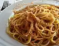 | Pasta chi Vrocculi Arriminati | ![]() | a pasta dish from Palermo which generally consists of a long pasta like spaghetti or bucatini, cauliflower, onion, raisins, anchovies, pine nuts, saffron, red chili, and breadcrumbs |