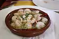 Gambas al ajillo everywhere seafood peeled shrimps cooked in a clay casserole with oil and garlic
