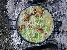 Kabsa can be made with goat meat and wild vegetables such as asparagus. This may be related to the origin of paella.