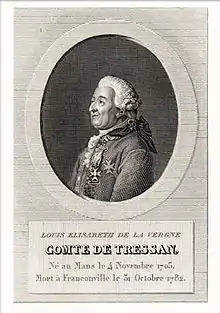 Louis-Élisabeth de la Vergne, comte de Tressan (4 November 1705, Le Mans - 31 October 1783, from a fall from a carriage en route to Saint-Leu-la-Forêt) was a French soldier, physician, scientist, medievalist and writer, best known for his adaptations of "romans chevaleresques" of the Middle Ages, which contributed to the rise of the Troubadour style in the French arts.