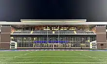 The press box and suites are located above the bleachers on the home side of Joe Aillet Stadium. Originally built in 1968 and expanded in 1988, the sky box was renovated and replaced in time for the 2017 season. The first floor of the facility includes multiple luxury suites for fans; and the second floor includes room for coaches, broadcast members, and gameday officials.[6] Additional signage was added onto the front, in time for the 2023 season, which highlighted the program's 3 national championships and 3 retired jersey numbers.