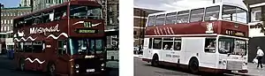 Merseymaid and Silver Service were brand names for cross-river double-deck Merseybus services between Liverpool and the Wirral via the Mersey Tunnels. Initially, a Willowbrook bodied Leyland Atlantean and five Alexander R-Type Leyland Olympians were refurbished at the Edge Lane works with soft trim, internal address systems and coach seats in November 1992, before then operating on routes 410 and 411 from Eastham to Liverpool. To attract passengers, the drivers of 'Silver Service' buses were given special customer care training, while MTL advertised a weekly ticket lower than four days' tunnel toll fees.[23] At the end of 1995, this operation was augmented with a batch of 30 similar specification Northern Counties Palatine II bodied Volvo Olympians, which were also used on other cross-river services.[7] Silver Service branding was dropped inconspicuously during 1998.