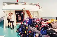 All 33 of the Conception's passengers and one of its six crew members were killed the night of the fire; the other five crew members, including the captain, escaped with injuries. The 34 killed were all sleeping in the lower deck bunkroom. Divers located 25 bodies by September 2, while nine other people remained missing. Four floating bodies were initially recovered at the time of the sinking, and another sixteen were pulled from the water later. Another five bodies were visible in the vessel but unreachable because of concerns about unsafe conditions on the boat.[35] The Coast Guard suspended search efforts on the morning of September 3, as it required the wreckage to be stabilized before searching it for further bodies. At that time, the unaccounted victims were presumed dead.[41][26] By September 4, all but one of the bodies had been recovered, with around 80 divers from six different agencies searching including members of the Federal Bureau of Investigation (FBI).[42][43] The last body was located by divers from the Santa Barbara County Sheriff and recovered on September 11.[44][43]